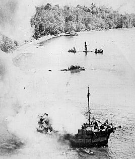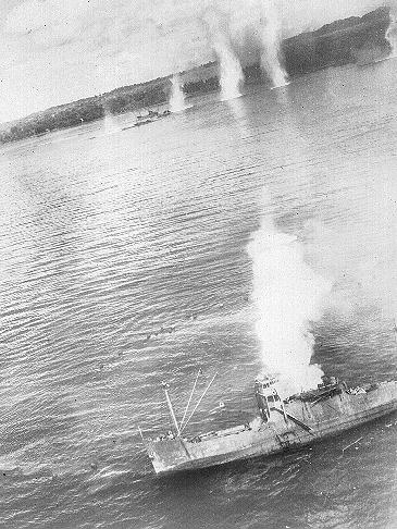 the 11 damaged by the 5th Air Force B-25's. Smoke from the blazing waterfront frames the
